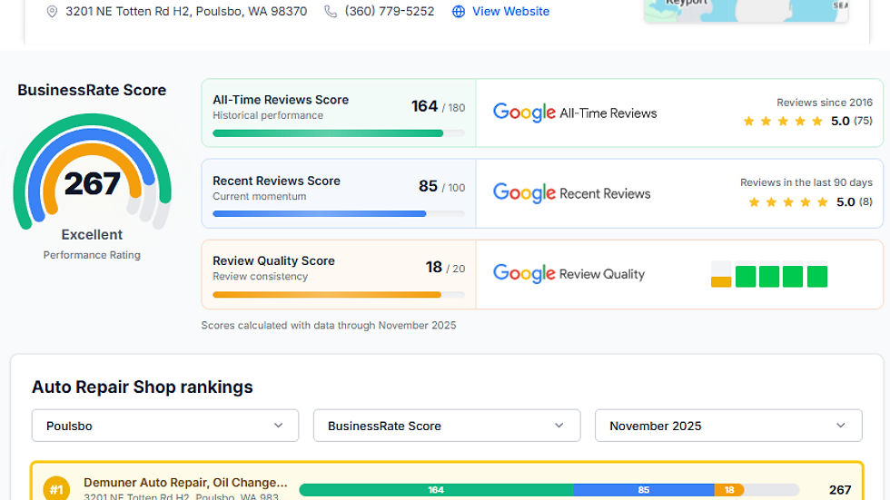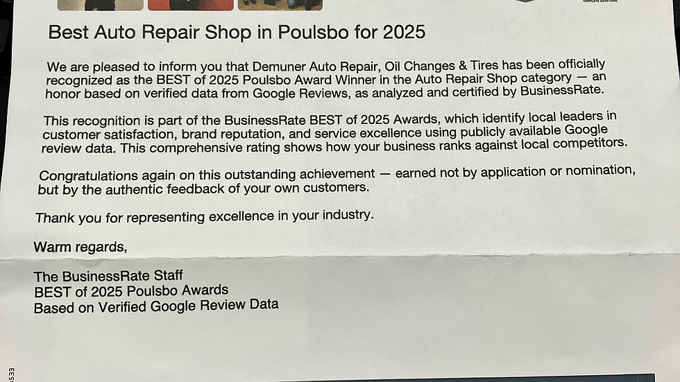 We are absolutely thrilled to share some incredible news with our community! Demuner Auto Repair has officially been awarded the title of "Best Auto Repair Shop in Poulsbo" by BusinessRate.com!